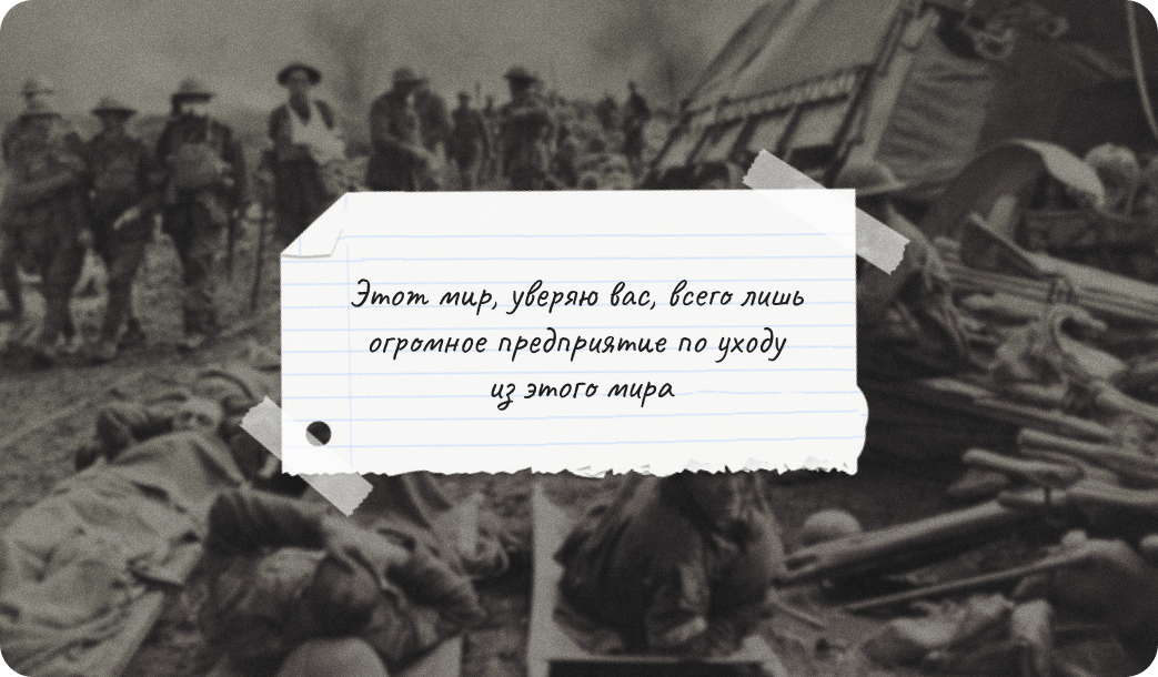 Мы видим, как война меняет мировоззрение Бардамю. Сначала он идет на фронт солдатом-добровольцем, но сталкивается с жестокостью, унижением со стороны командиров. Главный герой осознает, что люди стремятся на войну, так как в них заложено влечение к смерти. Об этом говорил Зигмунд Фрейд.