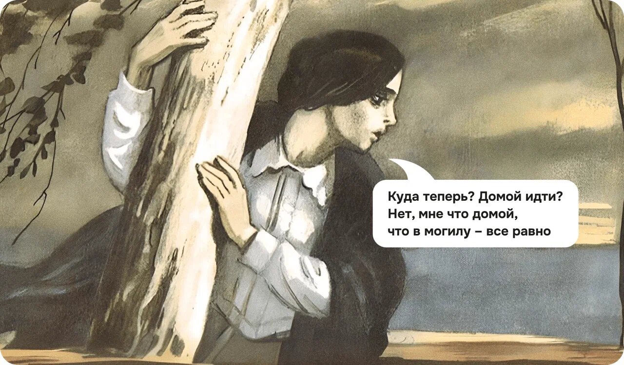 Возможно, ты слышал на уроках литературы, что причина ухода Катерины из жизни — измена мужу, которую она не может пережить из-за собственной религиозности. Однако, если читать текст более внимательно, то можно заметить, что это не совсем так. В предсмертном монологе Катерины нет сожаления или раскаяния в измене. Но она осознает, что после признания больше не сможет жить в доме Кабановых: «Куда теперь? Домой идти? Нет, мне что домой, что в могилу – все равно».
