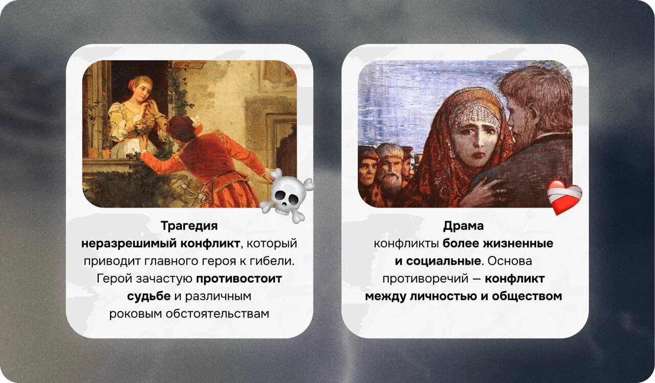 В драме конфликты более жизненные и социальные. Основа противоречий — конфликт между личностью и обществом, между разными социальными группами или даже между внутренними стремлениями и желаниями человека. Но здесь конфликт не усложняется фатальными обстоятельствами и чаще всего решаем.