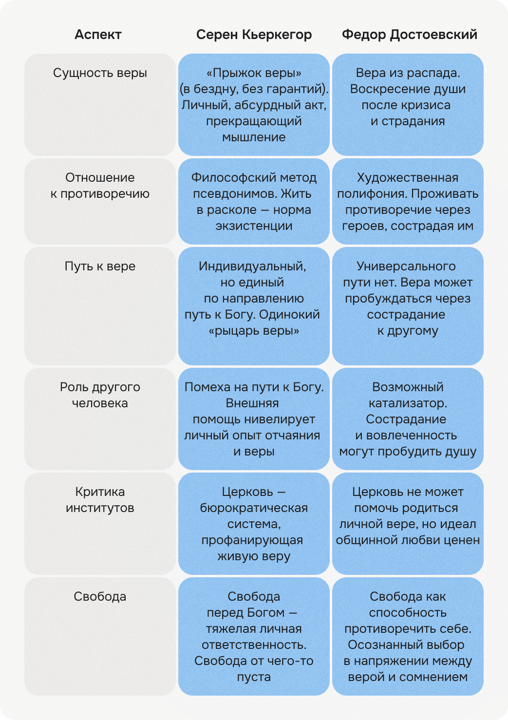 И у Достоевского, и у Кьеркегора вера не устраняет противоречие жизни, она существует в нем на более высоком уровне. Для обоих она не может стать избавлением от страдания, она всегда в состоянии крайнего напряжения. Сегодня мы видим в вере отказ от самостоятельности и критического мышления, попытку укрыться от неопределенности в готовых смыслах. В современном сознании она утратила ту глубину противоречия, которая у Кьеркегора и Достоевского делала ее испытанием силы, а не бегством от реальности.