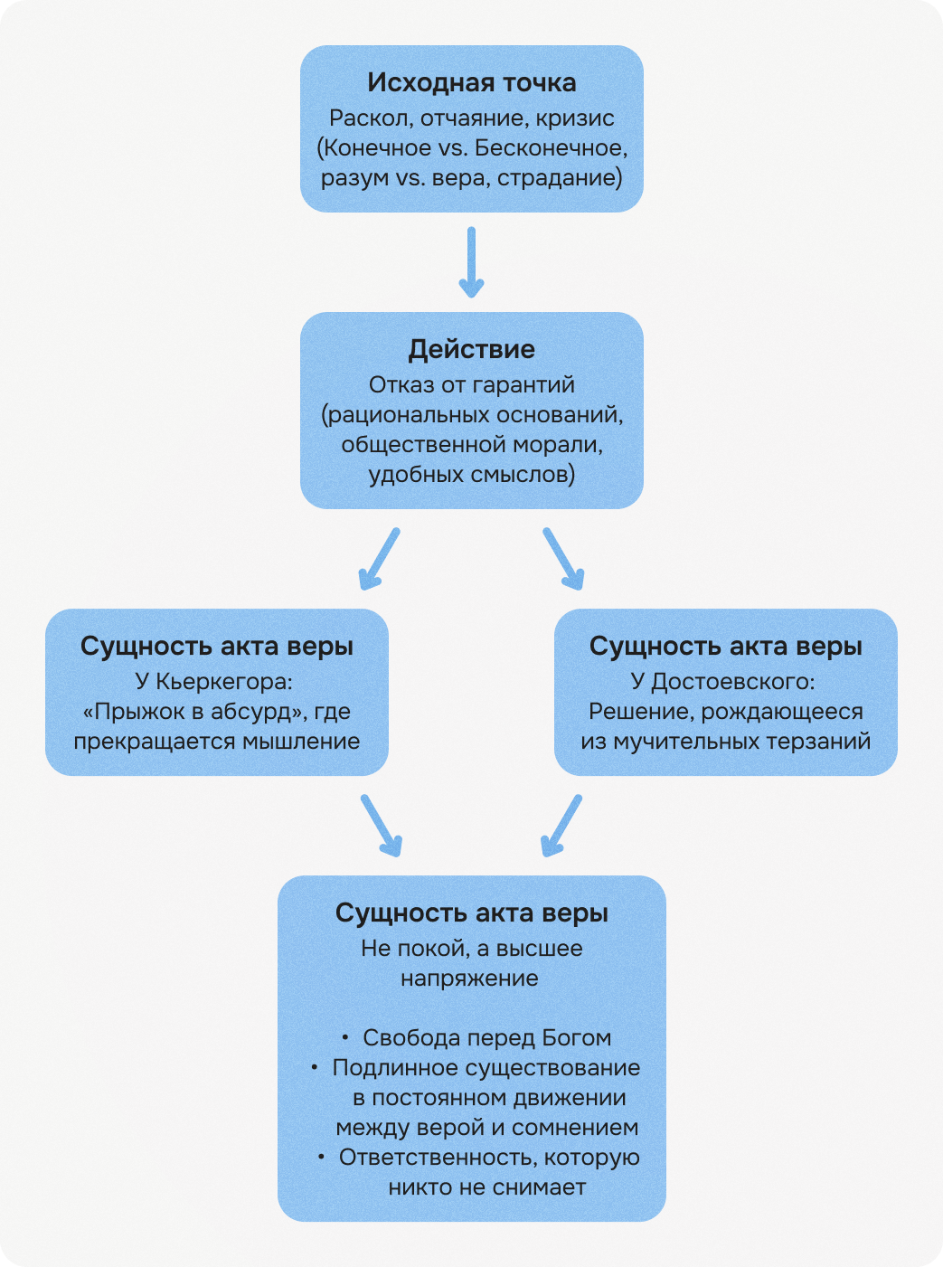 У Достоевского вера тоже рождается не из покоя, а из распада. Она не дается человеку как опора, наоборот, приходит тогда, когда все прежние основания разрушены. Это выход из греха, она возникает как результат и внутреннее решение уже после мучительных душевных терзаний. Это воскрешение души, всегда кризисное событие.