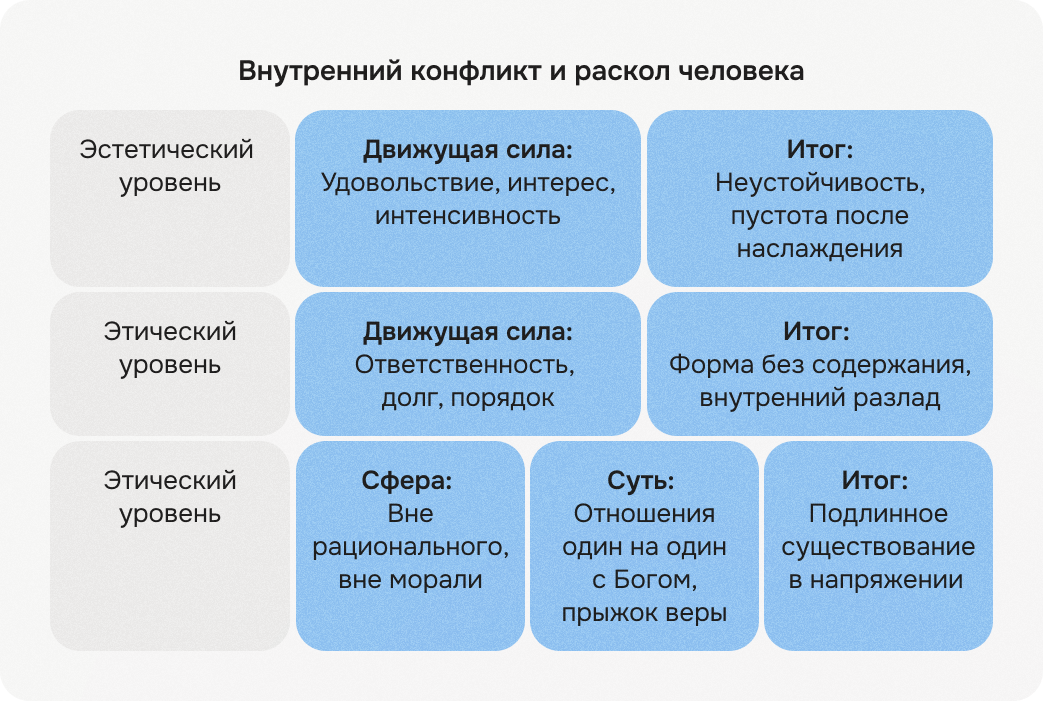 У Кьеркегора попытка осмыслить этот разрыв приводит к структуре из трех частей — эстетического, этического и религиозного. Однако это не лестница, не линейная структура, этапы которой мы можем пройти шаг за шагом, не инструкция в духе теории развития. Она показывает нам карту внутреннего конфликта, три уровня этого самого раскола. И человек всегда живет на всех из них.