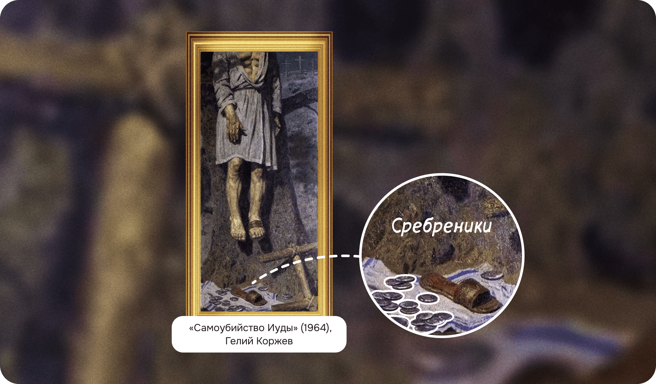 Коржев изображает Иуду не в момент предательства или раскаяния, а после самоубийства. Его тело висит безжизненно, а на полу лежат 30 сребреников — символы предательства. Лицо Иуды не показано, но его трагедия передана через символы: опустошенность и обреченность. Это не демонстрация насилия, а глубокое размышление о том, что предшествовало его поступку. В XX веке художники продолжили искать новые интерпретации образа Иуды. В центре внимания теперь не само предательство, а трагедия человека, доведенного до раскаяния и самоубийства.