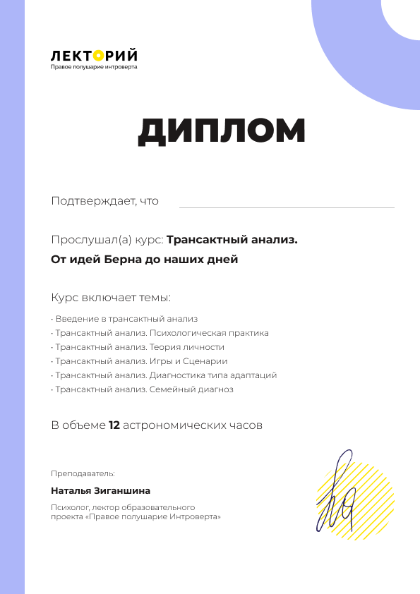 На этом курсе вы изучите теорию трансактного анализа Эрика Берна и получите практические приемы для самопомощи. Научитесь доверять себе и принимать самостоятельные решения. Узнаете все о теории жизненных сценариев, избавитесь от детско-родительских установок и научитесь управлять своей жизнью.